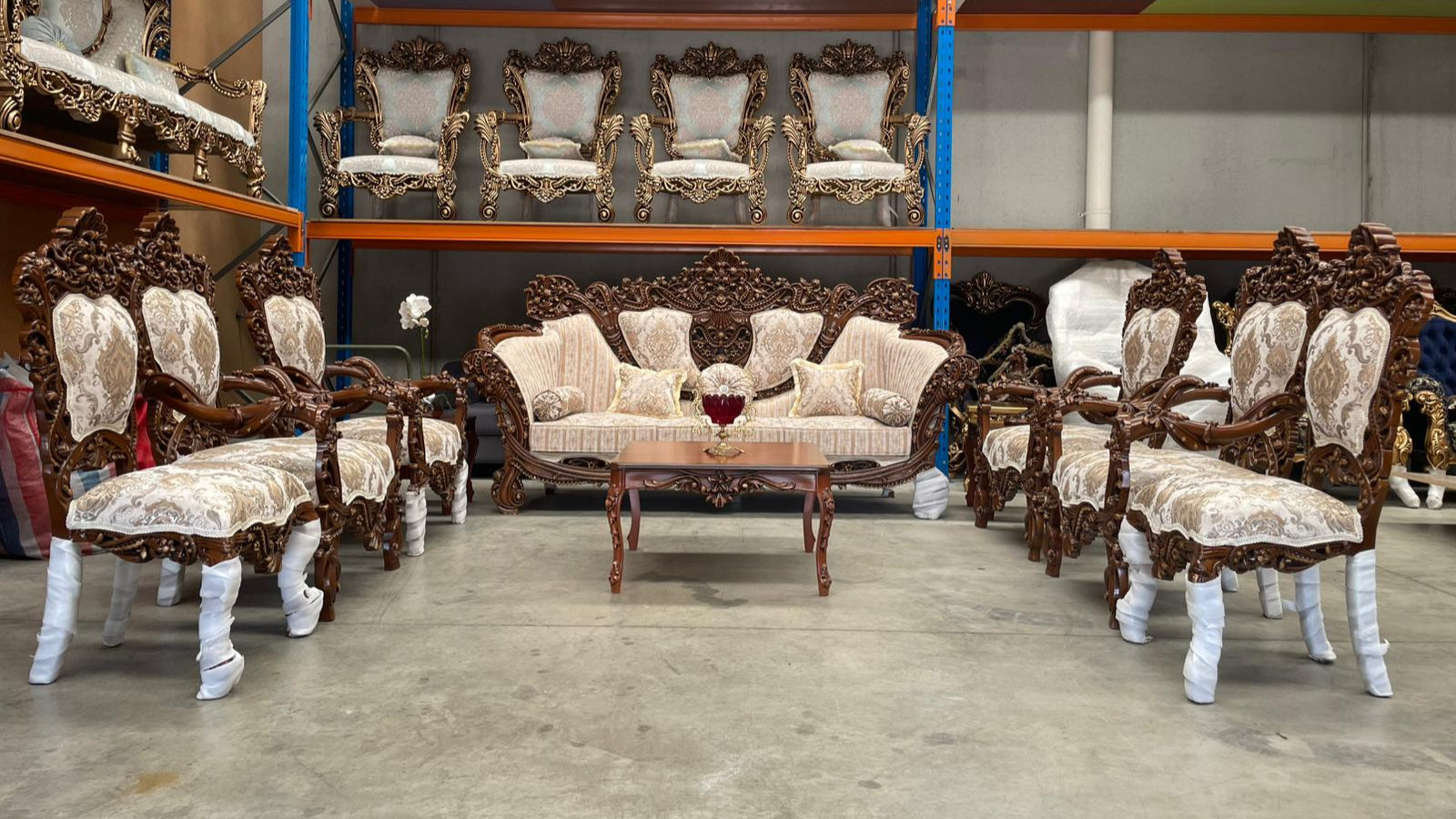 Almas 9-Seater sofa set – Hand-Carved Hardwood, Persian Fabric & Matching Tables